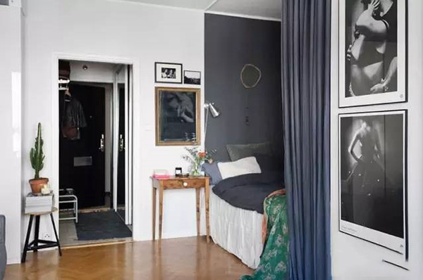 小開間最大的問題可能就是起居、臥室難以分隔。選擇不靠窗的相對私密空間,拉上一襲布簾,靜謐的臥室讓你睡起來也更加舒適。