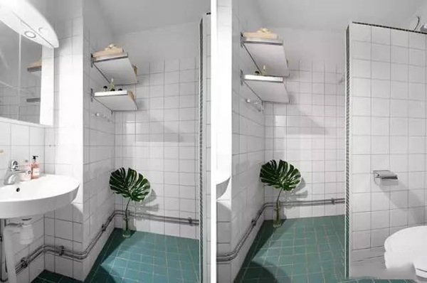 為了給空間擴張感,小浴室也盡量選擇簡潔全白。淋浴區與如廁區明確分隔,保證了小浴室使用的便捷性。如果租住的浴室沒有分區,也無法改動,干脆拉一襲浴簾,選個美美的簾子才更有趣呢!