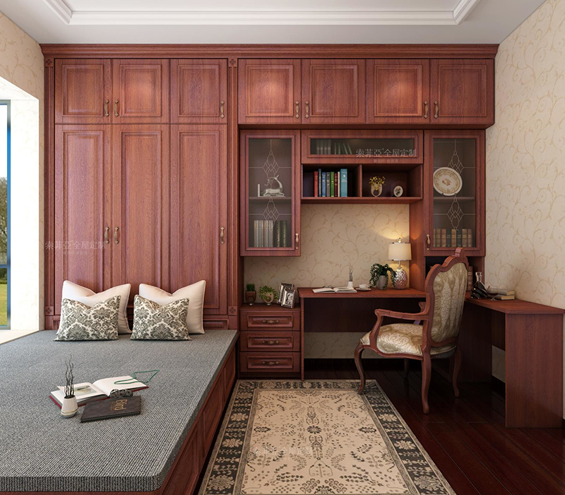 歐式古典風格書房設計,中部飄窗可作榻榻米客製化,讓書房保持風格統一。藏書功能更是有目共睹。采用深色板材客製化書櫃書桌,整個給人成熟穩重,低調內斂之感。
