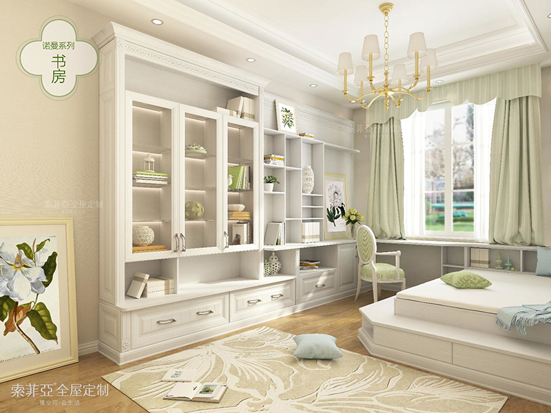 純白色清新浪漫書房,尤其適合簡歐式家裝風格的家庭選用。白色的書桌書櫃大方典雅,雕花精美。書櫃采用半開放式設計,滿足不同規格的儲物需求。虛實結合,彰顯高雅與品質。