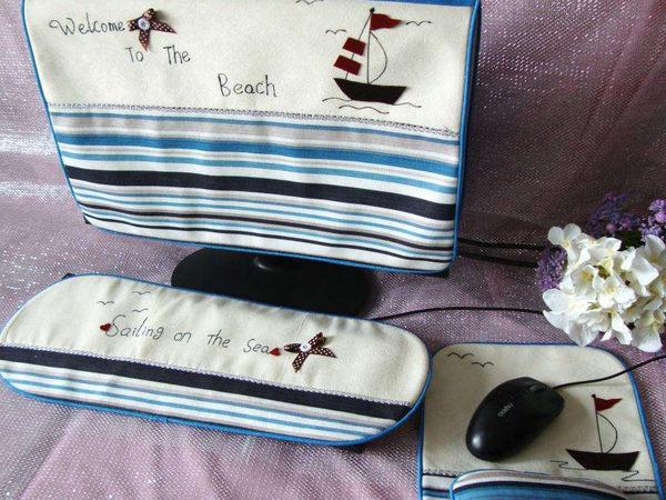 珍珠松品牌。它主要用于大尺寸的顯示器,也是手工縫紉,一套包括有顯示器罩子、主機箱蓋巾以及鍵盤蓋巾。面料是絨毛的,圖案很卡通可愛。很注重工藝細節。在行業里還是有一定知名度的,價格大約在80元左右。
