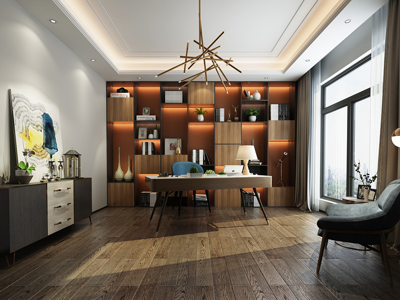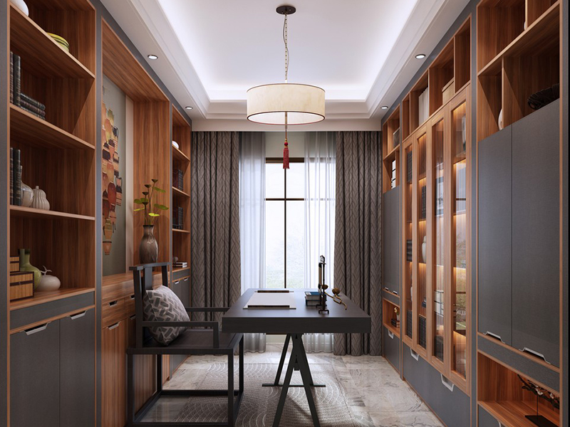 深沉而富有色澤的實木書房家具,雕刻精美,中式風格設計,古樸典雅之中透露幾分時尚之氣。高高懸掛的中國風吊燈,精致的雕花,溫暖的燈光,更添一份古韻。書櫃內設置的射燈,將整個書房烘托的別有一番韻味。