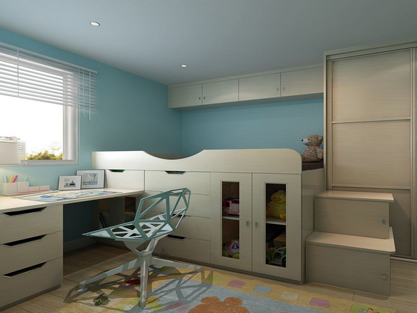 多功能書櫃床創意式的設計呈現在你眼前,兩層的設計合理的布置利用了空間。底部是小衣櫃和書架的環繞,右側的小樓梯也是很櫃子,一物兩用,在這里存放一些生活物件,變得更加有次序和條理。上方是小床的組合,四周護欄組合,增強了安全的保護,舒適的床品鋪設,舒適柔軟,很適合兒童房的設計布置。