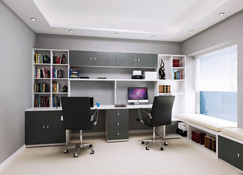 不但書櫃可以優先考慮定做。寫字臺也可特制。如兩人同時在家辦公和學習的寫字臺目前市場上難以尋覓,您不妨在沿窗子的墻面,做一個50公分左右寬、2米多長的條形寫字臺,則可同時滿足兩個人的需要。