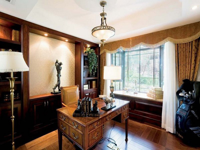 書房既然是作為工作和學習的地方,那么打造一個安靜的環境是非常必要的。在這一點上,可以從裝潢書房的材料上下手,比如隔音效果比較好的門或窗。屋頂選擇用吸音石膏來進行吊頂,地面也可以鋪設具有吸音效果的地毯,墻壁則可以使用軟包裝飾布來進行裝飾。
