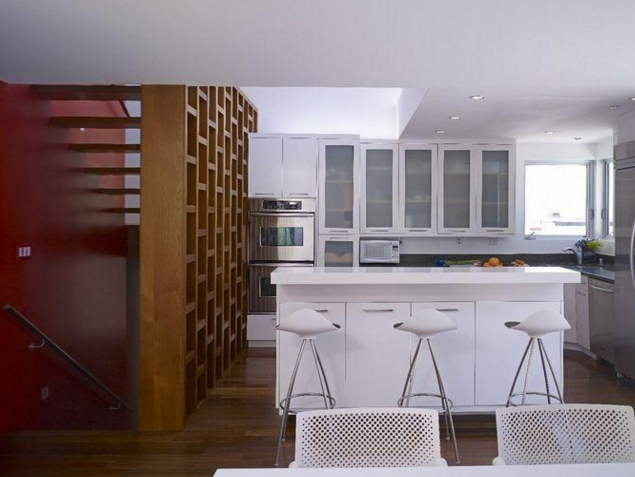 半隔斷形式的廚房,在開放式廚房中也廣為使用,例如吧臺隔斷,但是半隔斷的方式對于阻隔油煙的效果沒有很好。或者把廚房設計成局部開放式的,這種方式對于油煙阻隔的效果比較好,但是要考慮風向問題,以免造成油煙被風吹回到屋內。