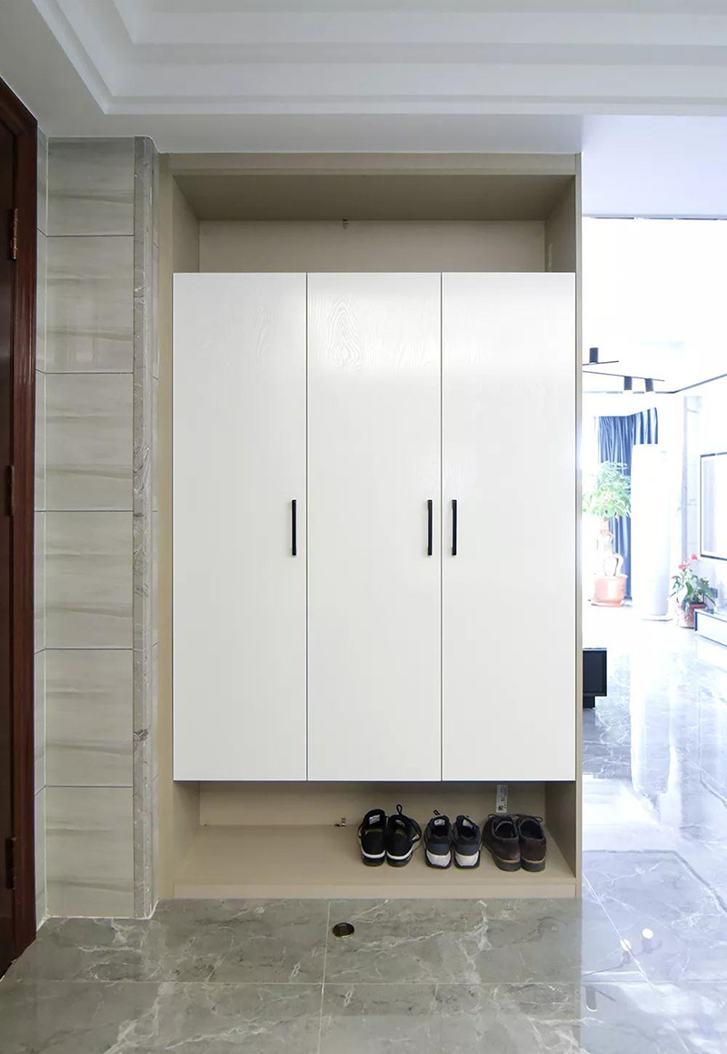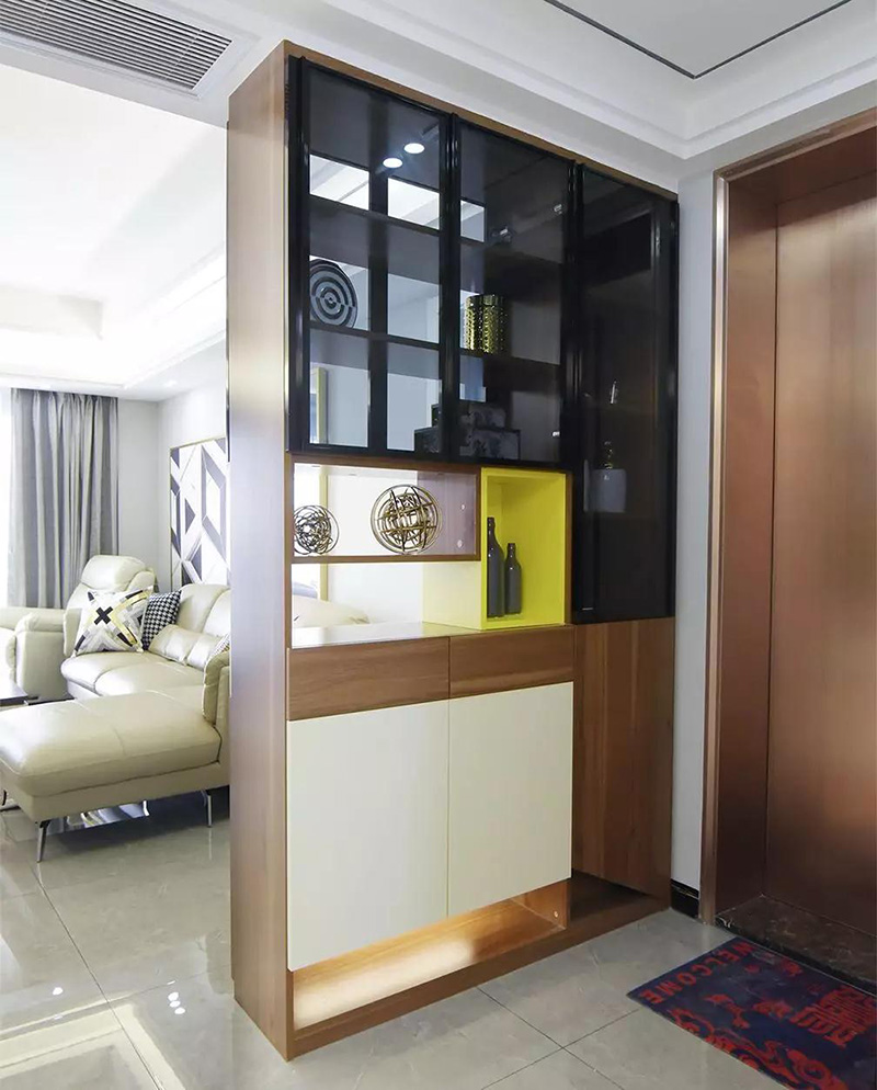 下方做鞋櫃,上方做展示,既不讓玄關顯得壓抑,又能讓客廳保持一定的隱私性。