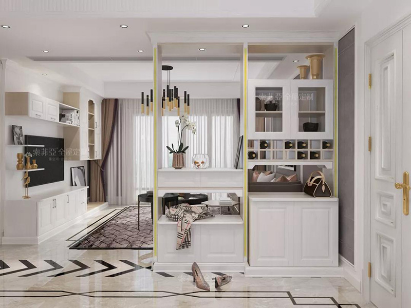 L型鏤空隔斷櫃,可將入戶櫃和餐酒櫃結合起來,功能更加多樣化,滿足更多收納需求。