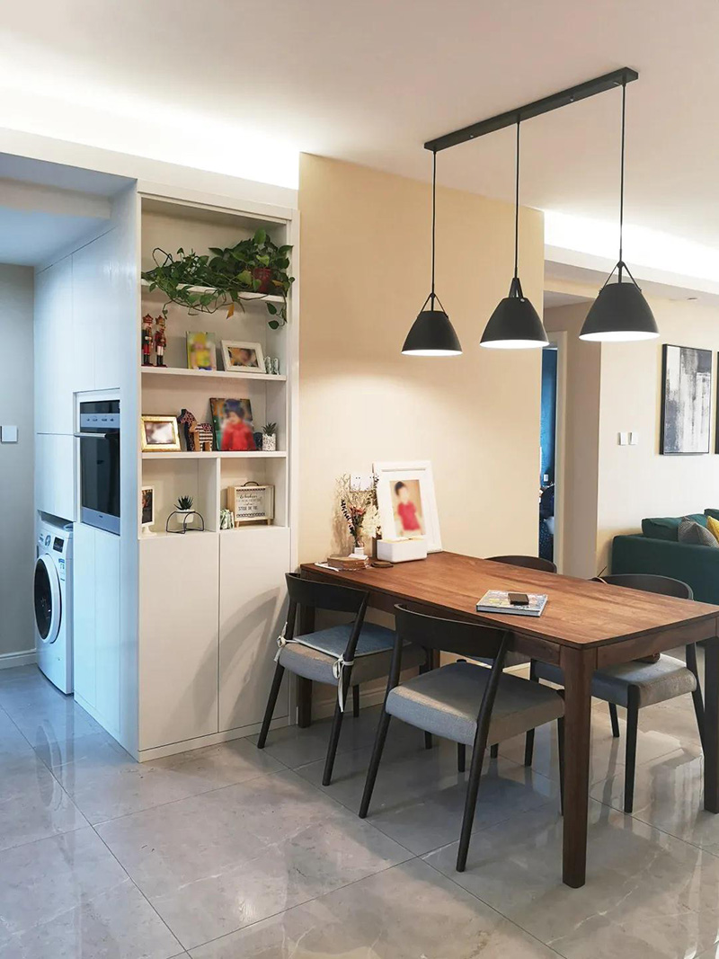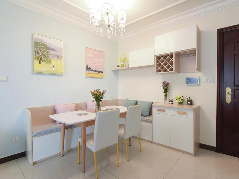 進門即餐廳的戶型,靠墻做卡座,對進門的通道動線更友好。