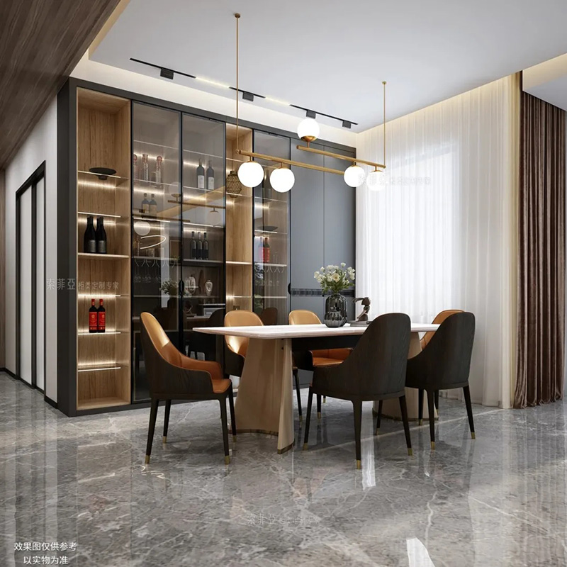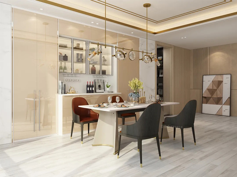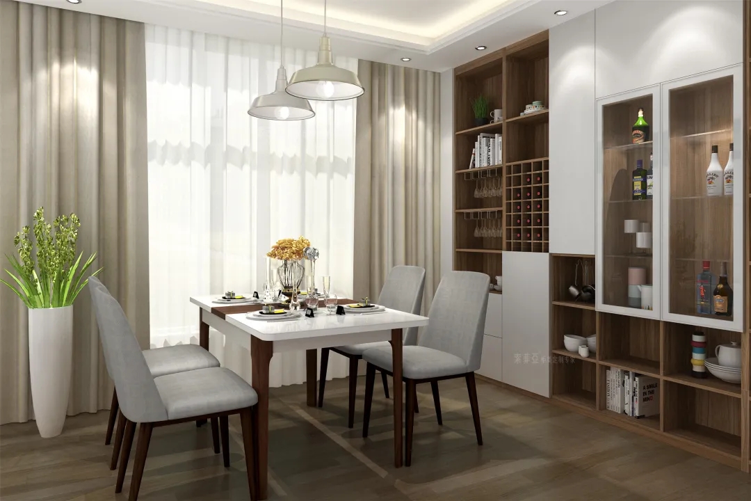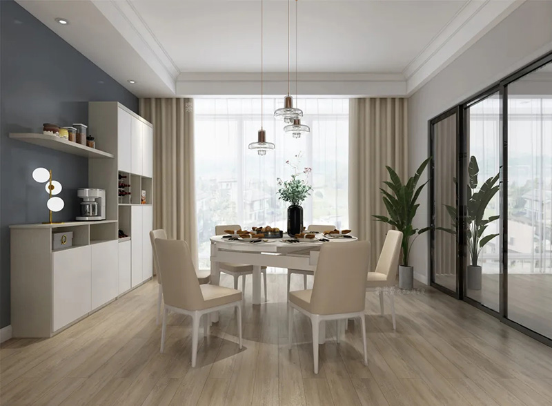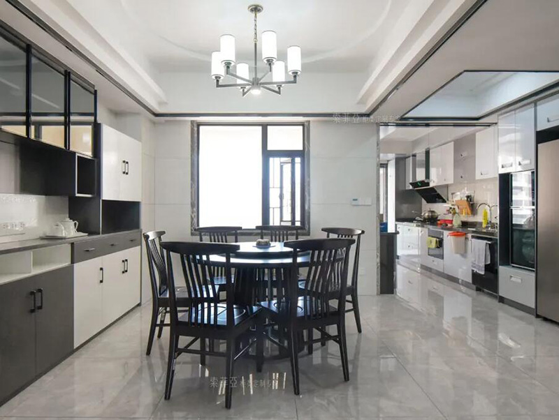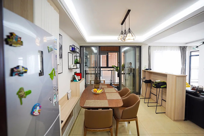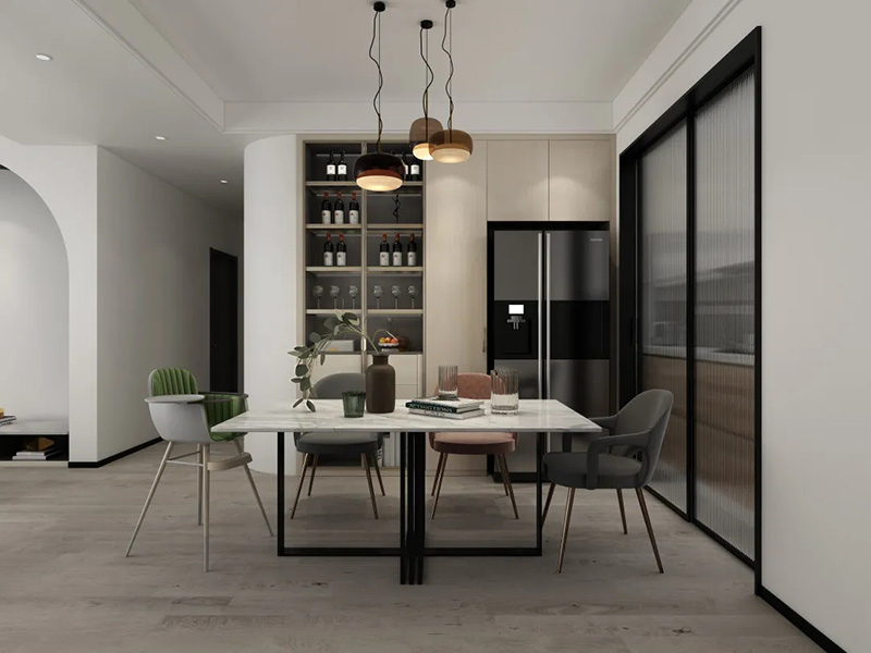 餐廳空間充足的情況下,我們當然希望餐桌盡量大一點。但現實情況是,如今精裝房鮮少能見大大的獨立餐廳,甚至會作為連通臥室和客廳的重要通道。想要入住后不鬧心,餐桌周圍就必須要留有足夠的活動空間。