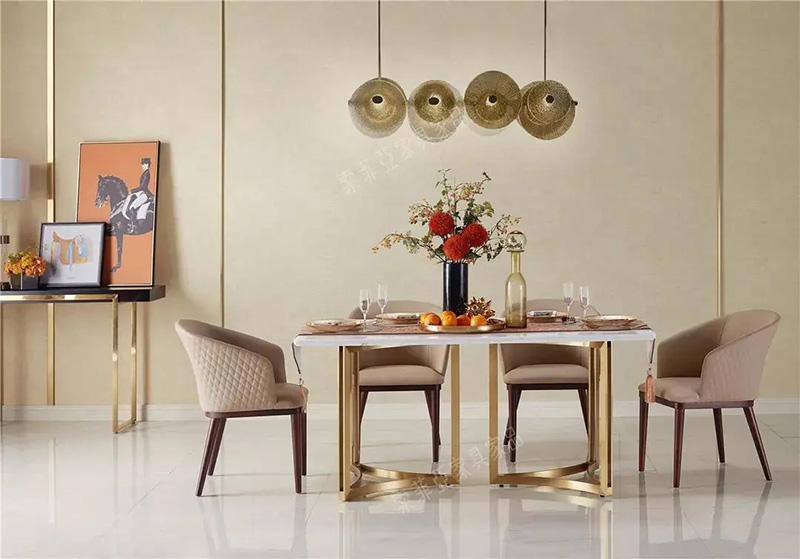 大理石餐桌也是目前主流的石材餐桌材料之一,大理石的天然紋理會比巖板更加豐富生動,可選款式也比較多,但在耐熱和防污方面,目前還是巖板略勝一籌。