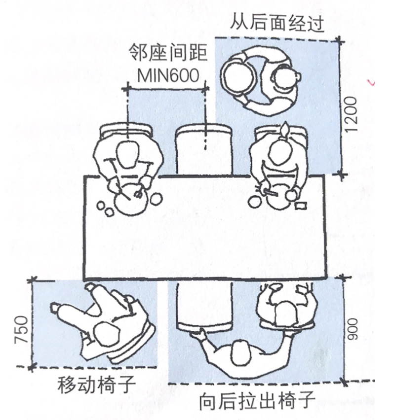 3、座位后面是墻,不需要留通道經過,餐桌到墻面僅需750mm(若餐廳空間過窄,至少留600mm,可從側邊拉出凳子)。
