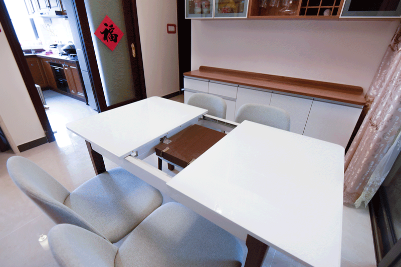 你還可以選擇一些可在方、圓之間任意切換的一體伸縮餐桌。畢竟,小孩才做選擇,大人全都要~
