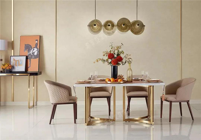 根據家里的裝潢風格選擇餐椅材質。日式或新中式選擇原木餐椅,輕奢風選擇鐵藝或金屬餐椅。美式或古典風格可以選擇較為華麗厚重的餐椅。如果與家里的裝潢風不搭,就可能有違和感。