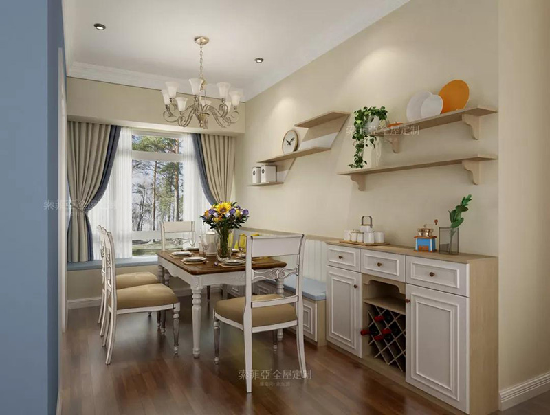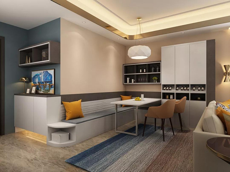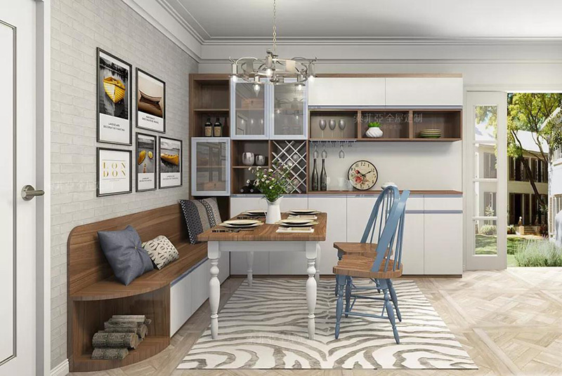 若你家餐廳和客廳在同一動線,靠墻定做一長排卡座也不錯,讓客廳、餐廳相結合,空間利用最大化。