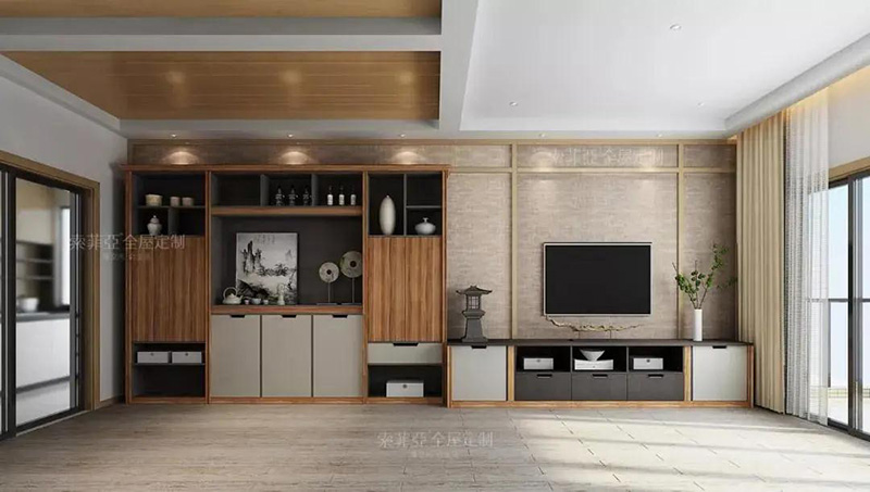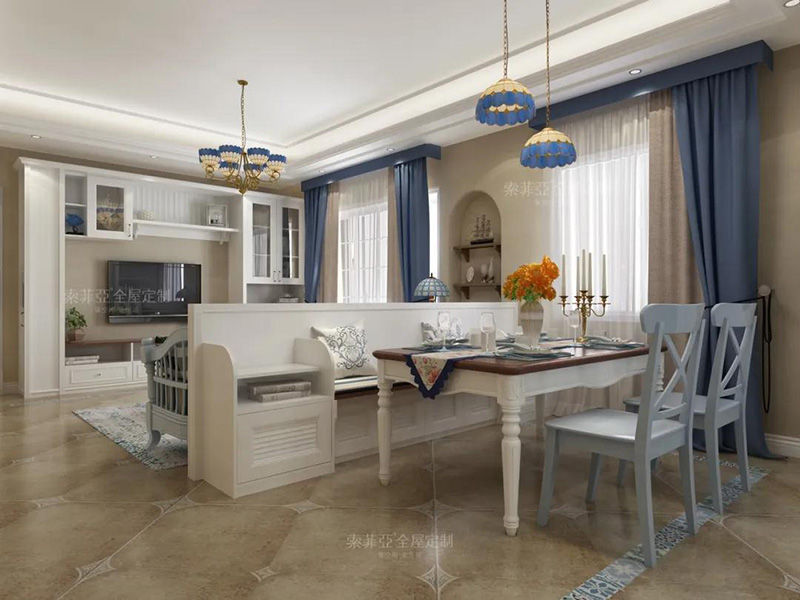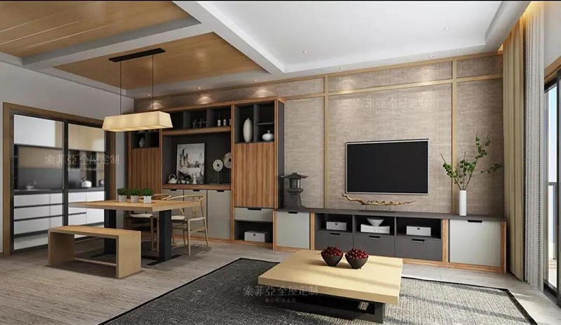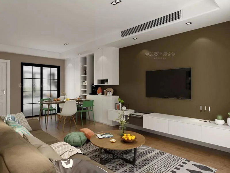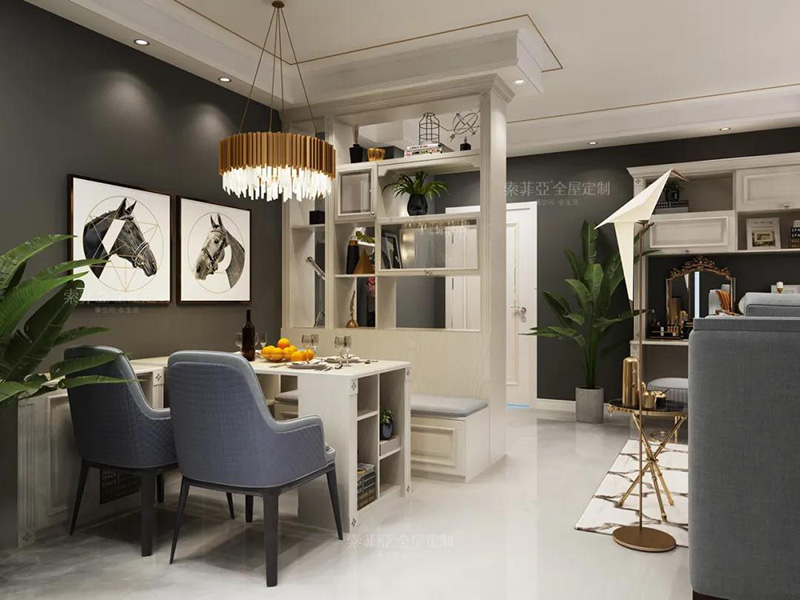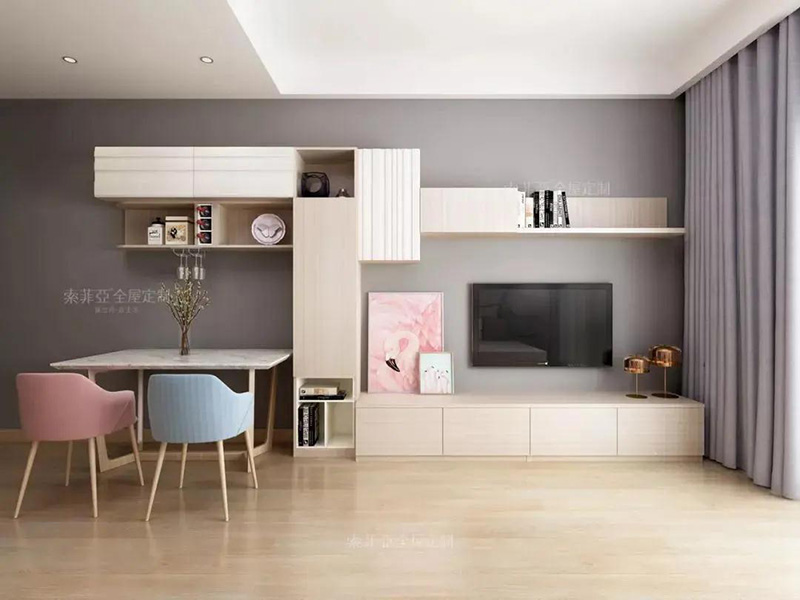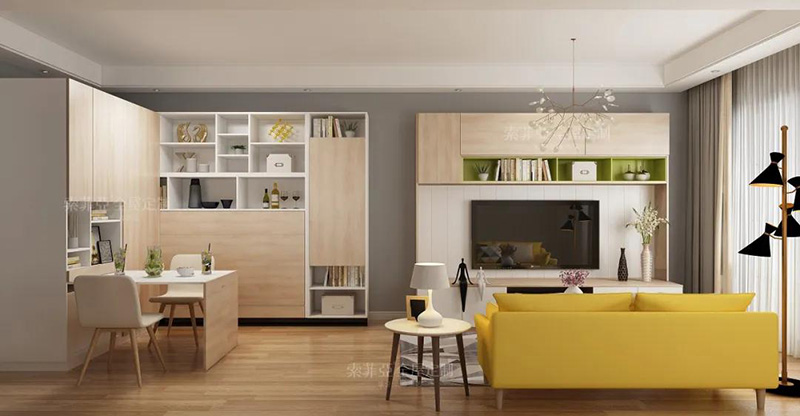 如果你家里的戶型是只有客廳,那么我們可以將餐邊櫃和電視櫃設置在同一面墻,利用櫃體在一個空間里劃分出客廳和餐廳兩個功能區。