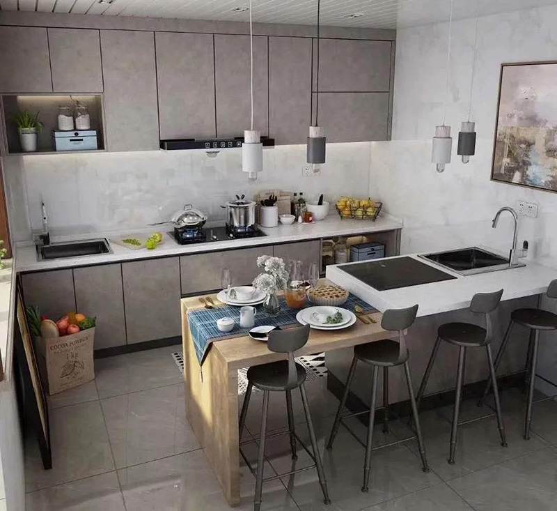 另外,餐廚空間打通之后,甚至可以不放餐桌椅,做一個島臺,既是廚房的操作臺,也是餐桌,連買餐桌椅的錢都省了。
