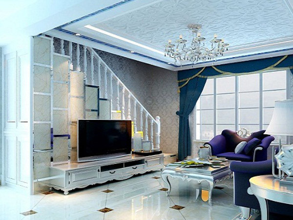 3、對于樓梯底部空間比較大的客廳設計,我們在樓梯的選材上可以選用鋼化玻璃,在樓梯的下面空間做成儲藏櫃的樣式,在這樣的櫃面上是可以掛置電視機的,這樣的設計既保證了儲藏的空間,同時也解決了電視機方位的問題,一舉兩得。