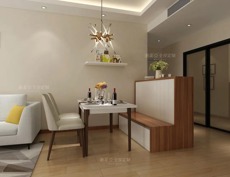 卡座除了省空間、收納等優點外,還有隔斷功能。設置在客餐廳之間,便成了最好的空間隔斷墻。