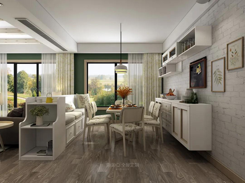 若你家餐廳和客廳在同一動線,靠墻定做一長排卡座也不錯,讓客廳、餐廳相結合,空間利用最大化。