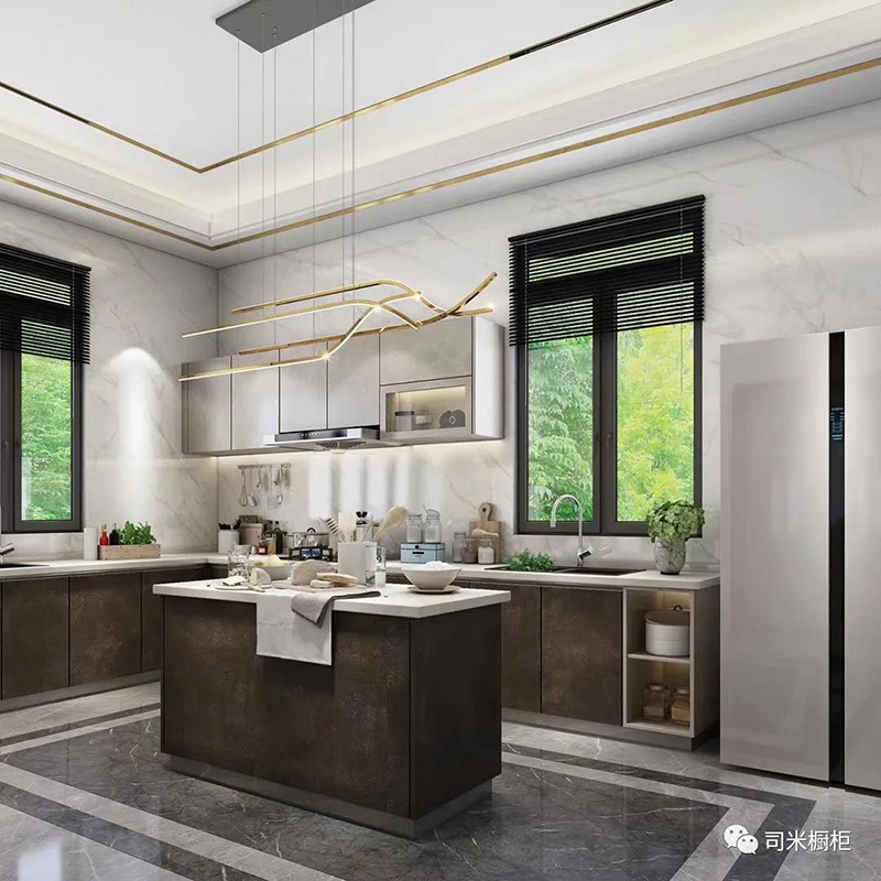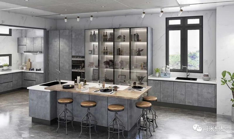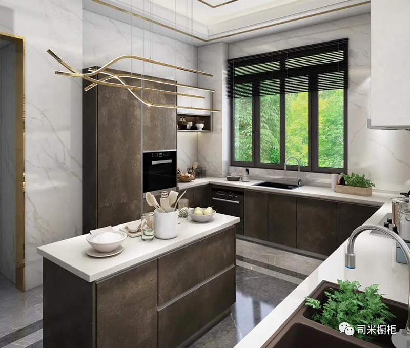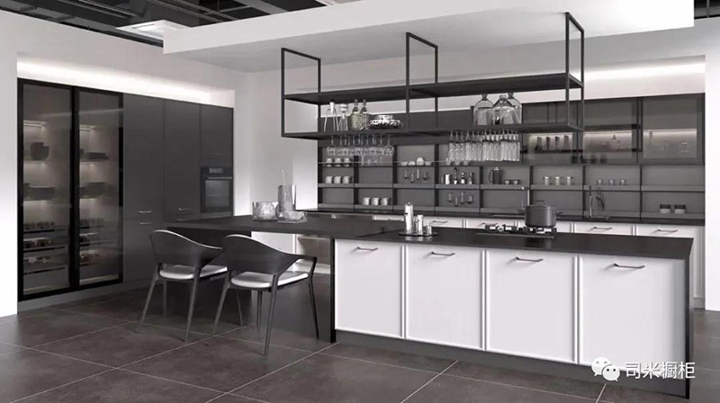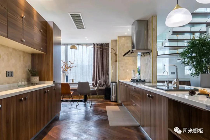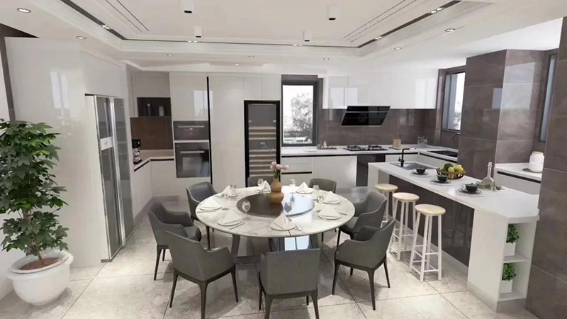 大空間采用的餐廚一體化設計,常在U型或L型廚房布局中延伸。在廚房中心位置設置島臺,將備餐區或延伸部分作為用餐區,個性且時尚。