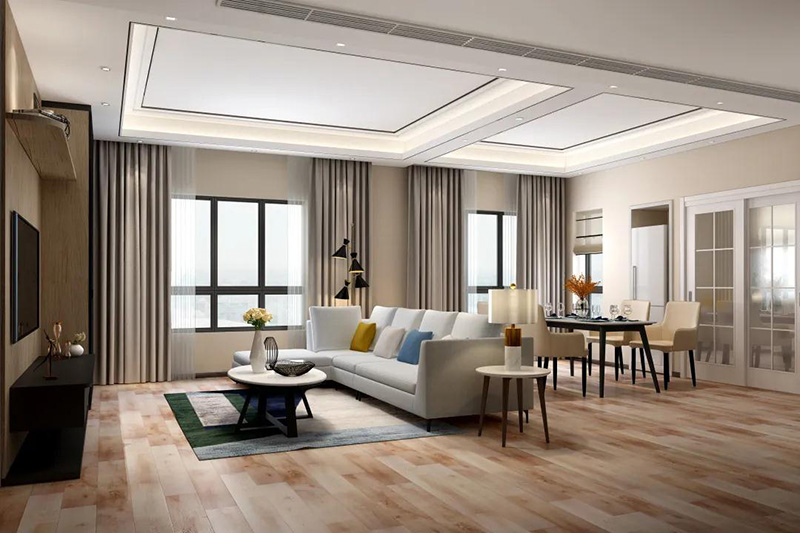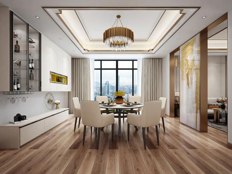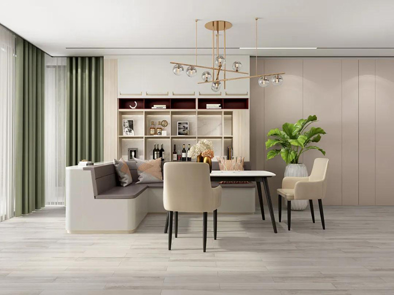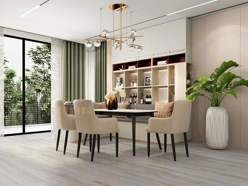 在暖色調的家居空間里,淺色的朗丁餐椅、淺色桌面,與地板、沙發、茶幾等家具色調保持一致,共同打造溫馨舒適的客餐廳空間。