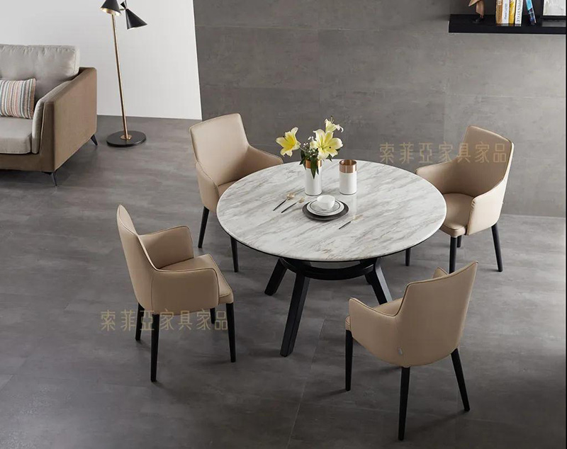 意式簡約風格的朗丁餐桌椅,天然大理石材質的質感,簡單造型的時尚感,以及實木桌腳的穩固性,將生活的實用性與藝術美感融合,營造出奢華的高級感。