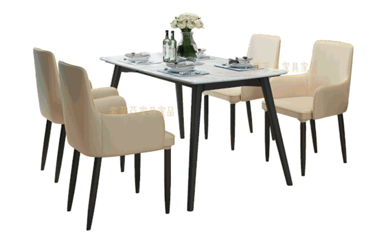 設計簡練的方形朗丁餐桌,白蠟木實木腳、天然廣西白大理石的溫潤質感,以其包容的個性,輕巧的融入家居環境,呈現出優雅精致的高貴品格。