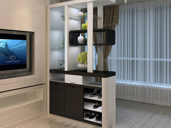 大多數家庭的客廳進門玄關隔斷都會與鞋櫃組合在一起,上半部分可以放些裝飾品或是收納些生活用品,而下面可以用來擺放鞋子,一舉兩得。而且玄關隔斷通常做成白色的櫃體,給人一種整潔、清晰的感覺,讓人們留下好印象。