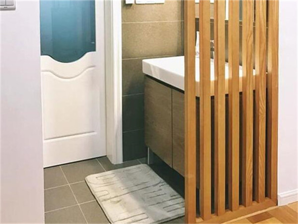 洗漱臺與過道之間,用豎條柵欄做簡易隔斷,隔而不斷,也不會影響採光,還增加了設計感,顯得新穎別致。