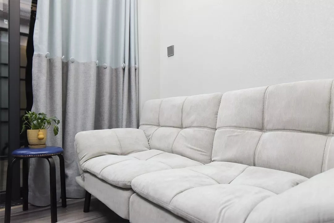 客廳墻面刷了暖黃色乳膠漆,天花板則是挖空了的純白色內凹吊頂,裝上燈帶,這樣的挑高式天花設計讓整個客廳的光線十分均勻。
