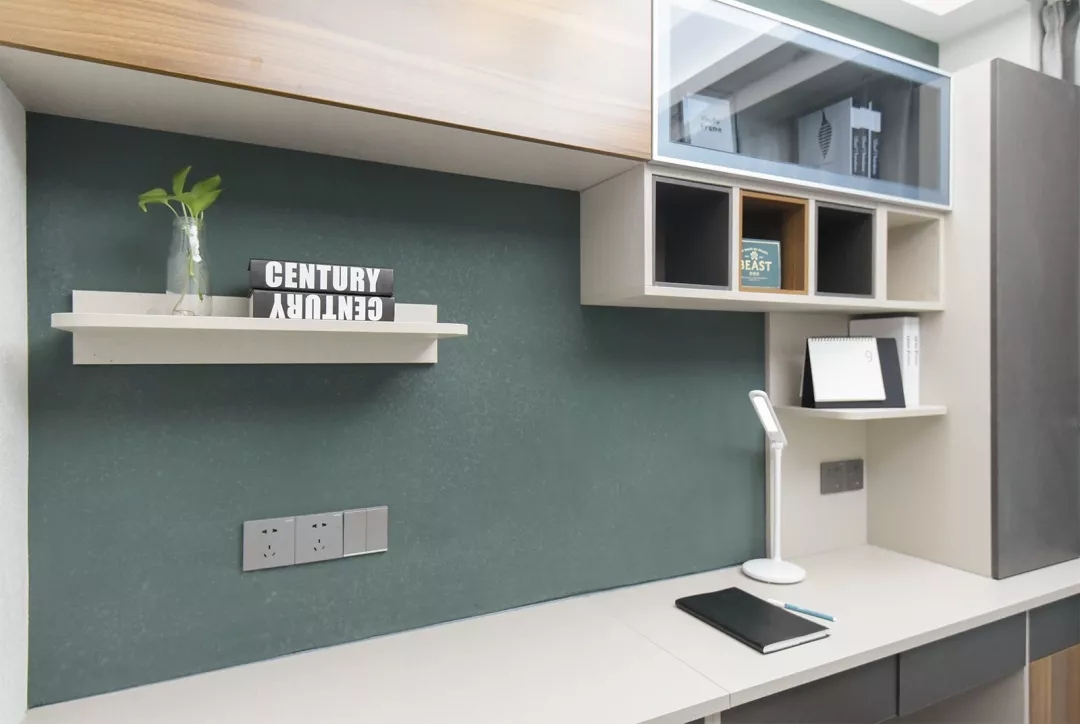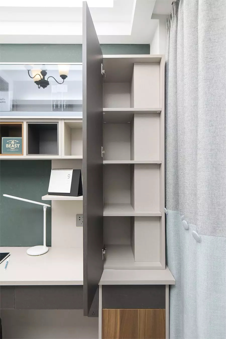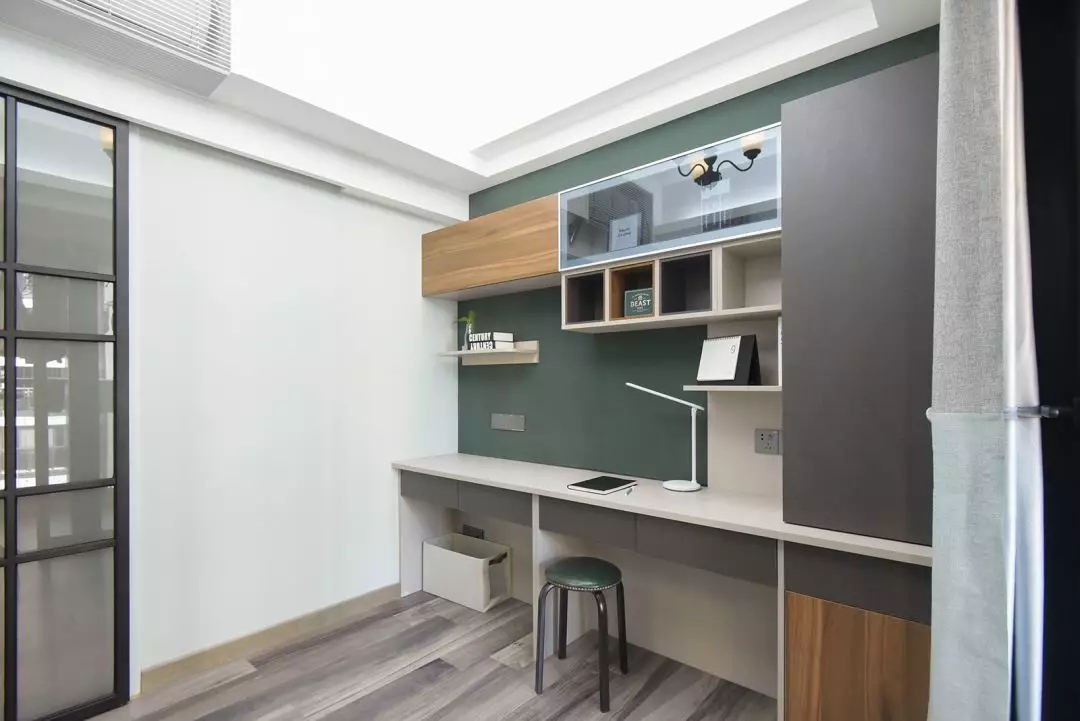 前面也有提到,@洪哥一家人對這個書房的配色都很滿意。把書櫃那面墻刷成墨綠色,深淺色布紋+胡桃木色巧妙搭配,這樣的色彩碰撞打造超豐富層次感。