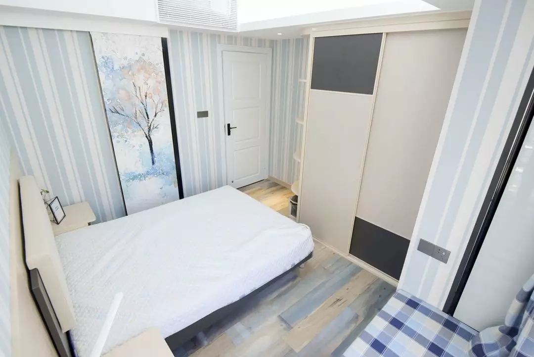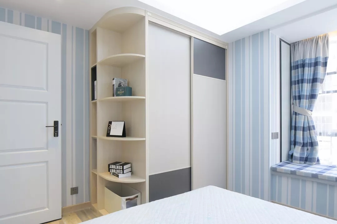 舒緩的藍色壁紙能營造寧靜、安定的睡眠氛圍,深淺色布紋搭配的趟門衣櫃和正對著的床頭靠板呼應了色彩。
