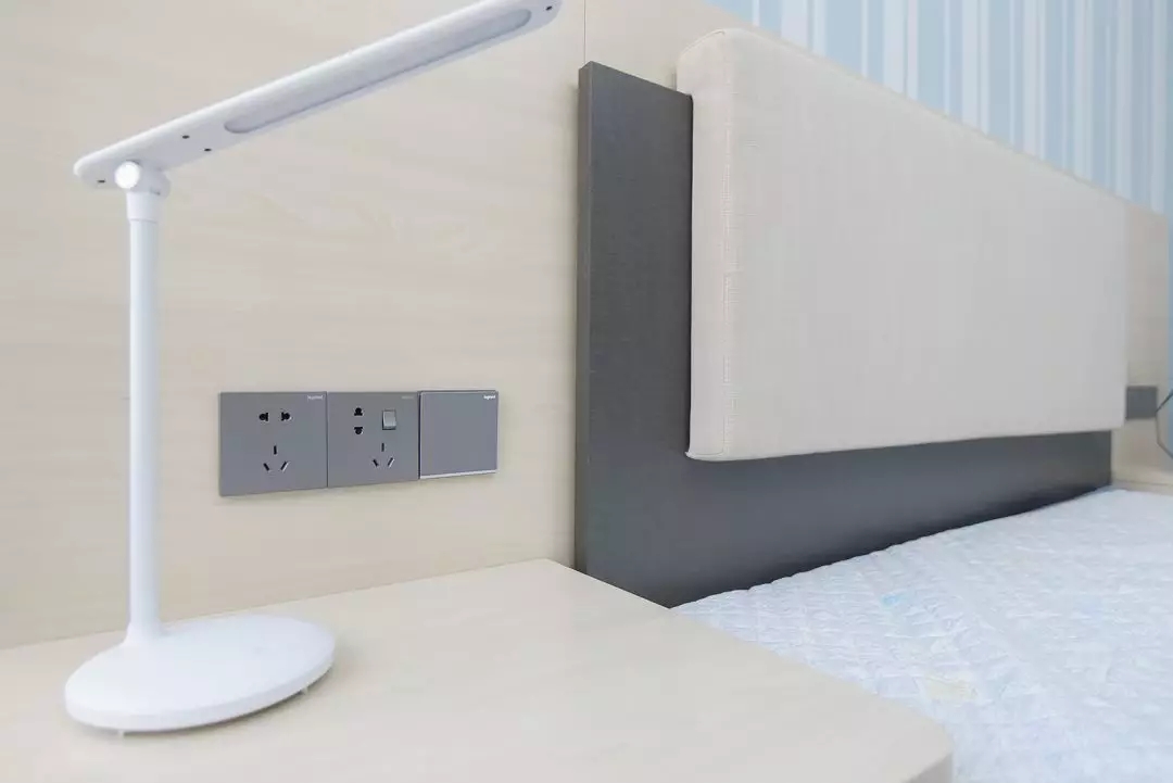 按照生活體驗感來說,床頭插座略高于床頭櫃,使用起來最方便。設計師選擇了和床頭板同色調的插座,每一個細節的用心處理都會讓這個家變得更美。