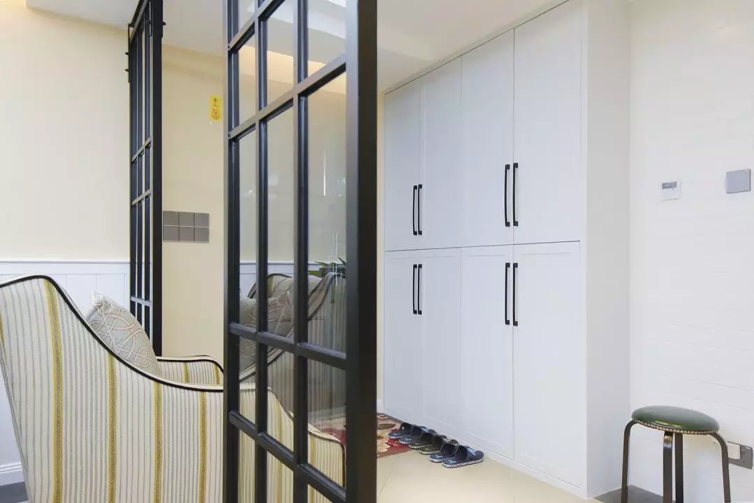 兩扇半隔斷式的黑框玻璃門給@洪哥的家隔出了一個相對獨立的入戶空間,透光又美觀。(沒有獨立玄關的伙伴可以參考這種操作)