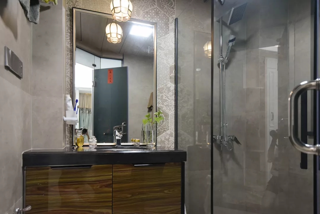 金色鏡框和金色花型小吊燈,配上高級灰瓷磚的點綴,小小衛生間也彰顯整個家的格調。