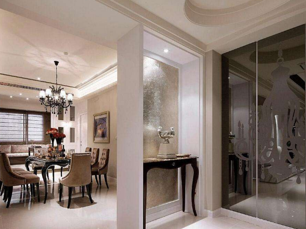 2.玄關隔斷時應該以通透為主,所以,使用的材料可以是磨砂玻璃或者珠簾一類。如果由于家裝風格所致,必須要使用實木,也應該選擇顏色較為淺淡或者做成博古架的形狀以增加通透感。切記不要使用厚重的深色實木,這樣會讓人覺得壓抑,還顯得笨拙。
