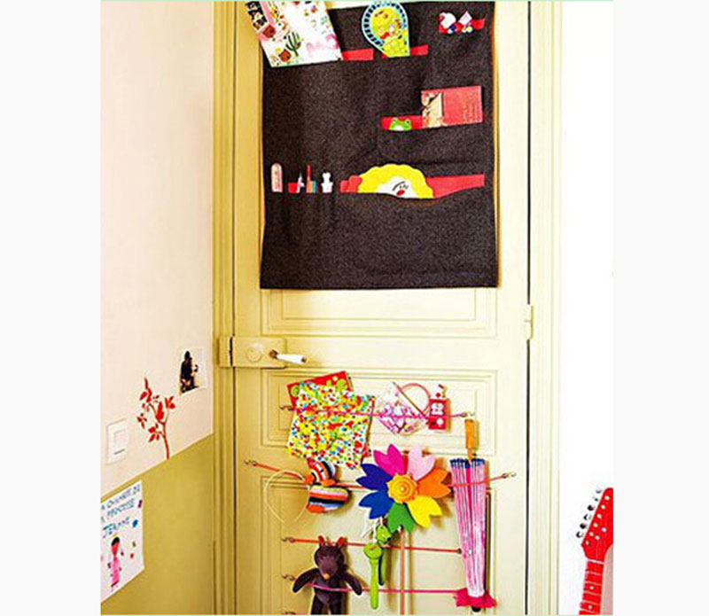 簡易的收納袋和拉桿就能將孩子的玩具一一納入,讓原本單調的門后變得極具溫馨感。門上方較高的收納袋放置了孩子不常用的物件,下方的拉桿可以隨意依據喜好更換卡通玩具,色彩鮮艷的物品能給整個房間增添一份可愛的童真。