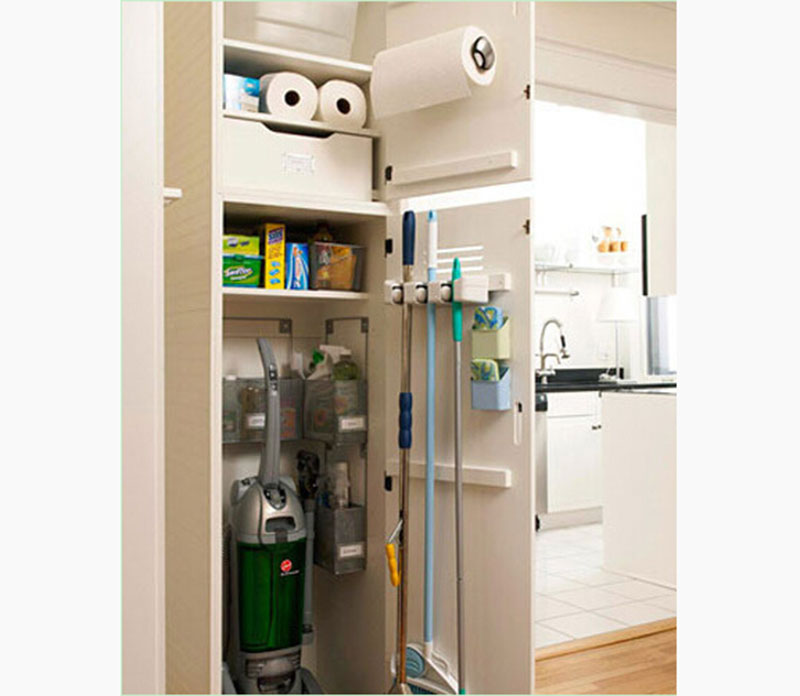 于壁櫃中辟出一角落專門用來收納吸塵器、掃帚等清潔用品。拉開櫃門,安置了收納架和小巧的收納盒,將最常用的工具等放置于此,更加利于拿取。樸素的格架能收納進更多的清潔用品,封閉式的收納設計讓家美觀時尚。