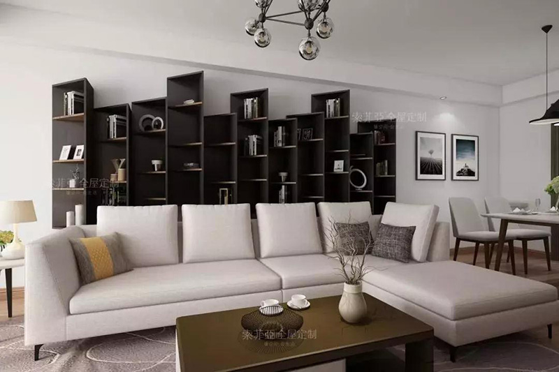 除了常規的電視櫃之外,沙發背櫃也是收納型客廳布局的一大幫手。