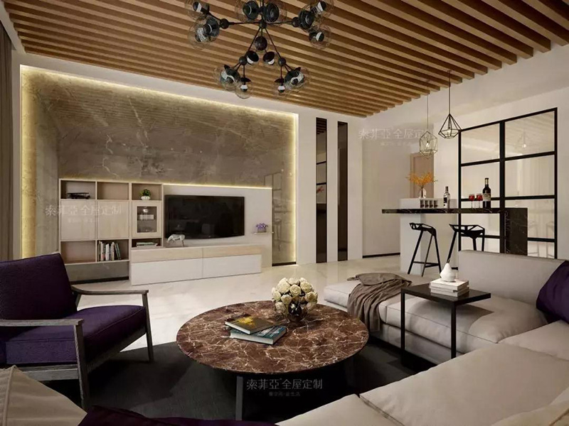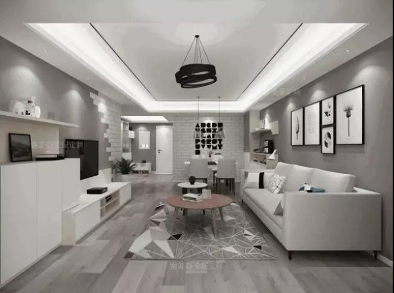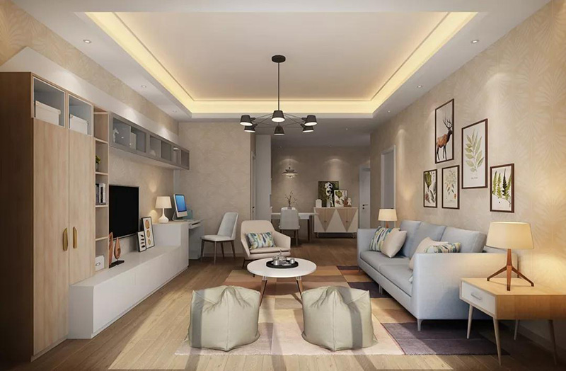 平行布局最常見的做法是,沙發沿墻體擺開呈一字型,與茶幾、電視櫃形成平行。