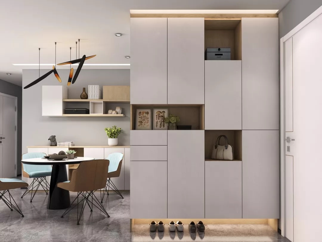 這種帶有隔斷功能的入戶櫃,底部除了可收納鞋子外,上面鏤空的展示架就能擺放裝飾和一些鑰匙、手機、交通卡等小物品。