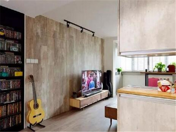 木質的電視背景墻自帶獨特的紋理,本身也是不同的木材拼接而成,可以把門自帶的縫隙也變成背景墻的一部分,完全找不到門的所在。
