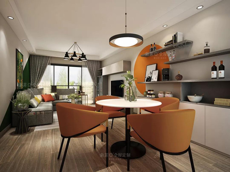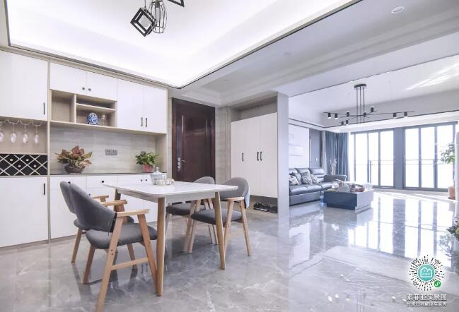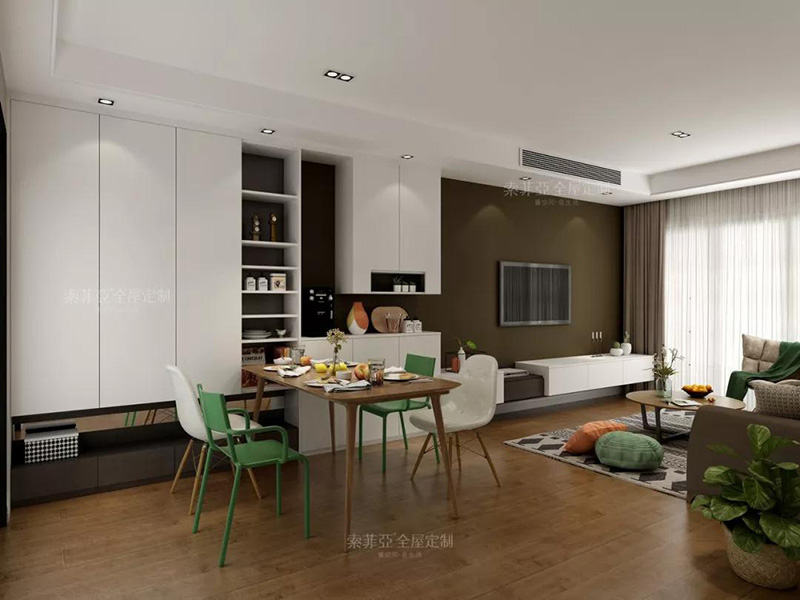 當然,如果空間充足的情況下,電視櫃或沙發背櫃和餐邊櫃的配色、花紋相近,櫃體適當地分開也不影響整個客餐廳的協調感。