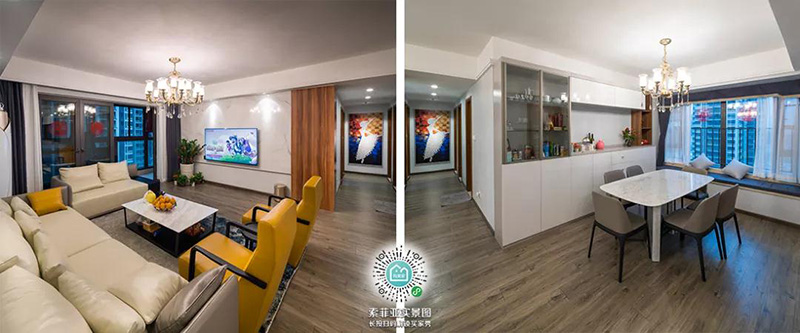 餐廳背景墻的明黃色和客廳沙發顏色呼應,雖然是跳躍的亮色元素,兩個空間互相制衡,消除了突兀感。