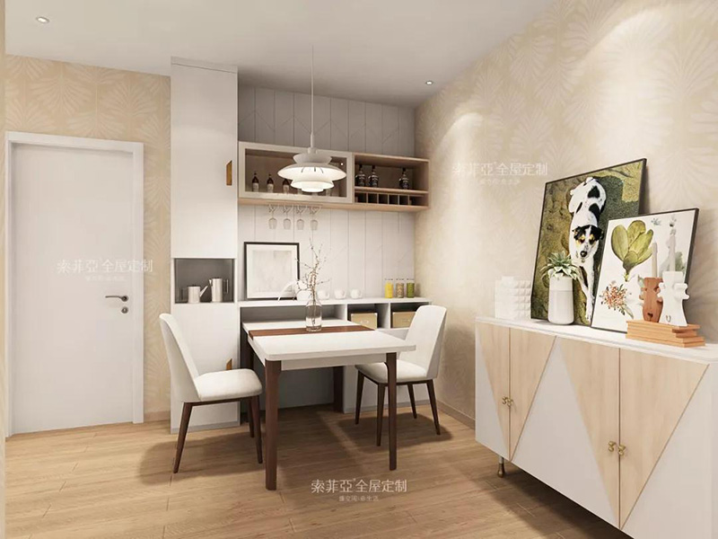 餐邊矮櫃不需要太高,一般齊腰即可,除了收納餐具外,櫃面還能當做置物區,放置紙巾、水壺、調味料等等。