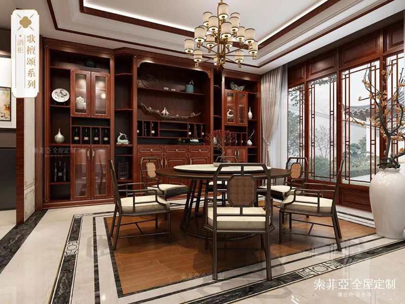餐邊酒櫃用來收納餐具和美酒,因此一般會做到頂才有足夠大的收納空間。此外還會放置一些擺件,成為餐廳的風景線。