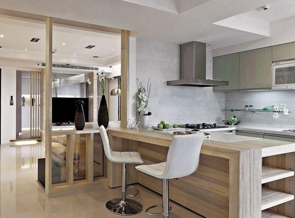 1、水電安排。在設計廚房吧臺的時候要先將位置設計好,因為位置將會影響設計效果,也會影響后面的制作過程,特別是水電怎麼安排。