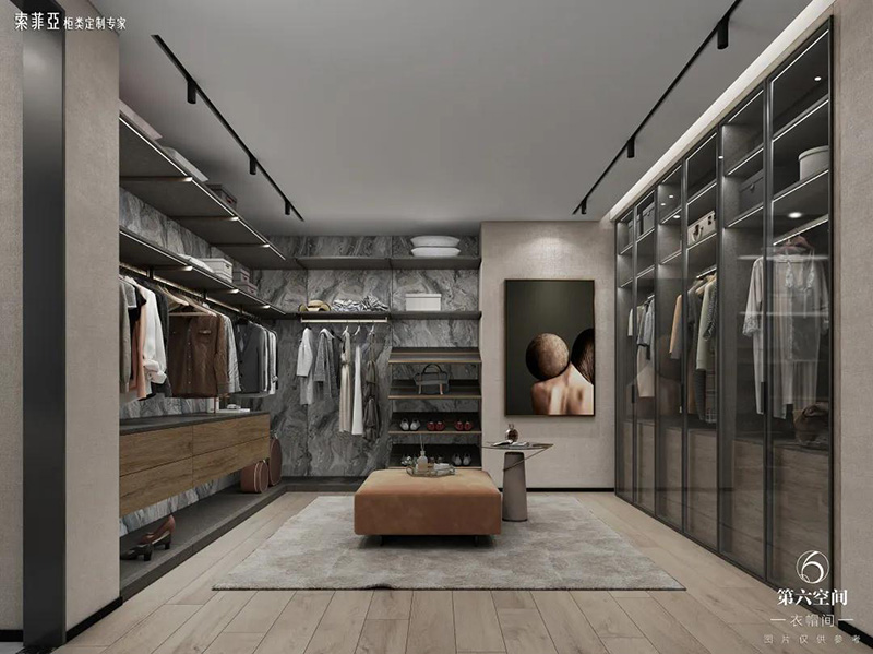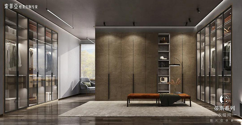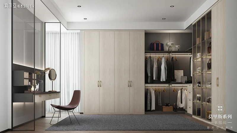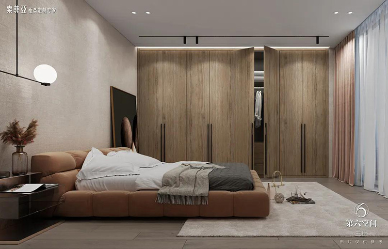 直紋柚木與布拉格紋交錯設計,簡潔特色紋理打破常規,在平凡的日常中發現獨特美,搭配經典獨一無二的超高法式鋁框門,重新定義輕奢生活。