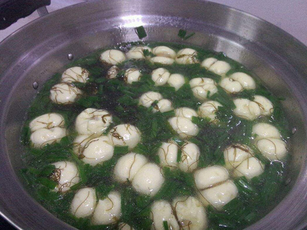 d、把雞湯燒滾,倒入老抽、雞精調均勻,沖入具有肚尖和發菜碗里,澆上芝麻油就可以了。